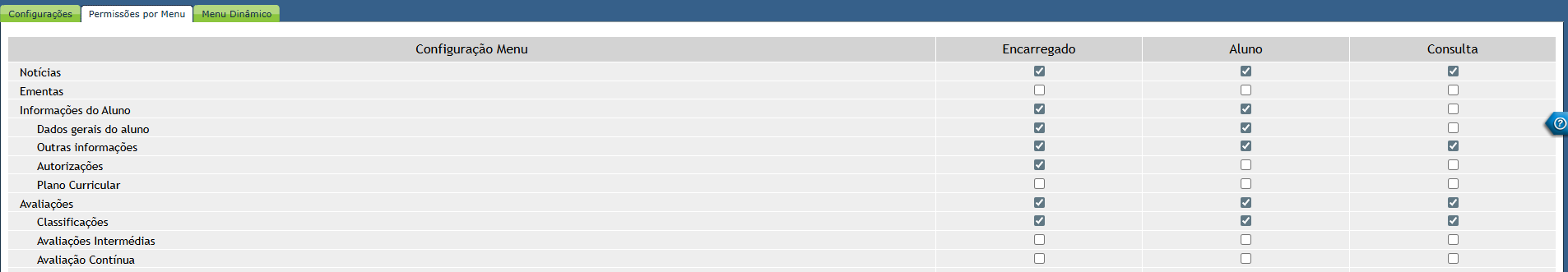 Nota: Se estão a configurar o eCommunity pela primeira vez, na questão da visualização das notas será necessário verificar se o menu de avaliações está configurado como visivel aos EE´s. Esta configuração é efetuada no menu eCommunity no e-schooling, e no submenu configurações > permissões por menu, tendo de ter o visto em avaliações e classificações para os EE´s terem visualização do menu.